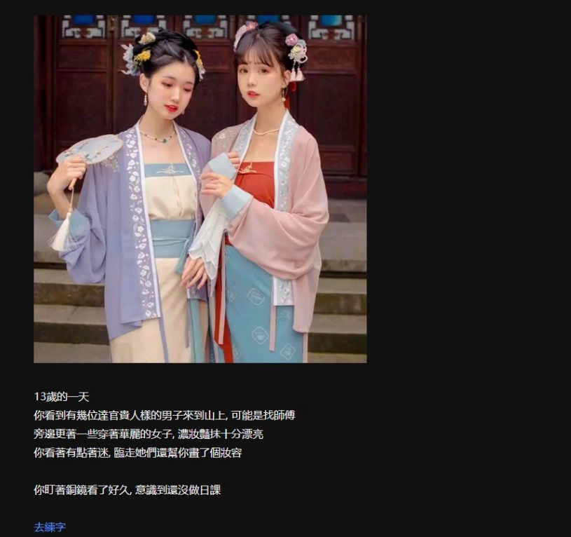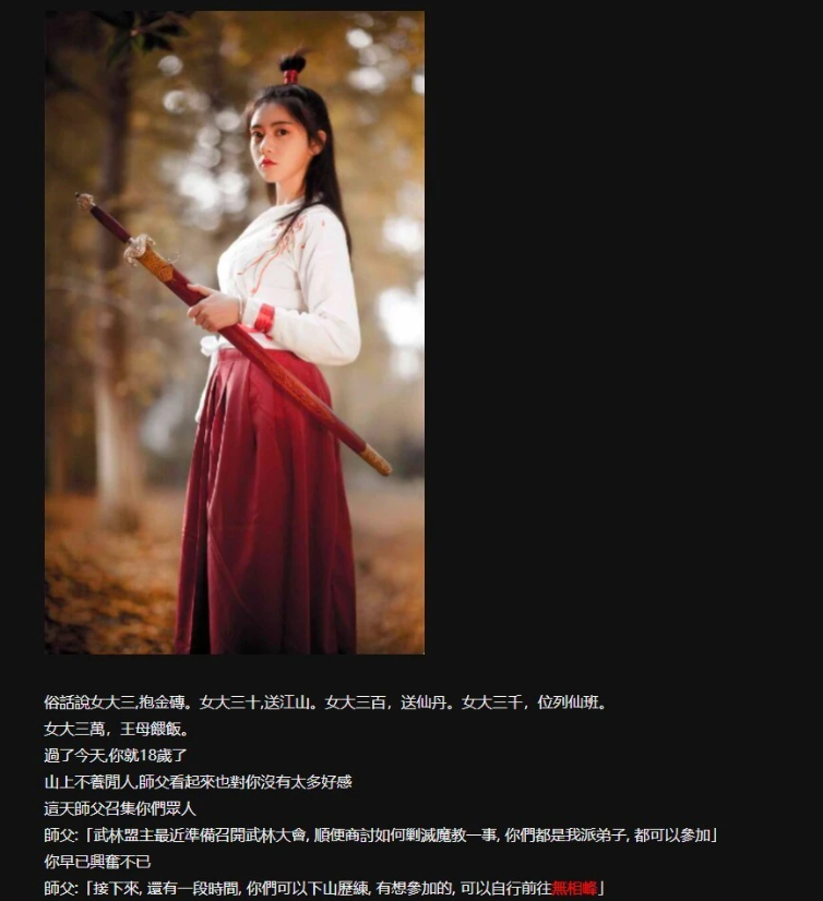 游戏中你扮演一个江湖女侠,从小成长到到大美人后修炼武功行走江湖的故事。