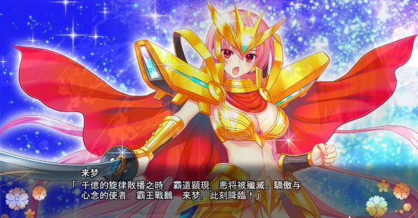 「千亿旋律挥洒、霸道显现之际,将罪恶诛灭殆尽。骄傲与思念的使徒,霸王战姬☆来梦,降临!」