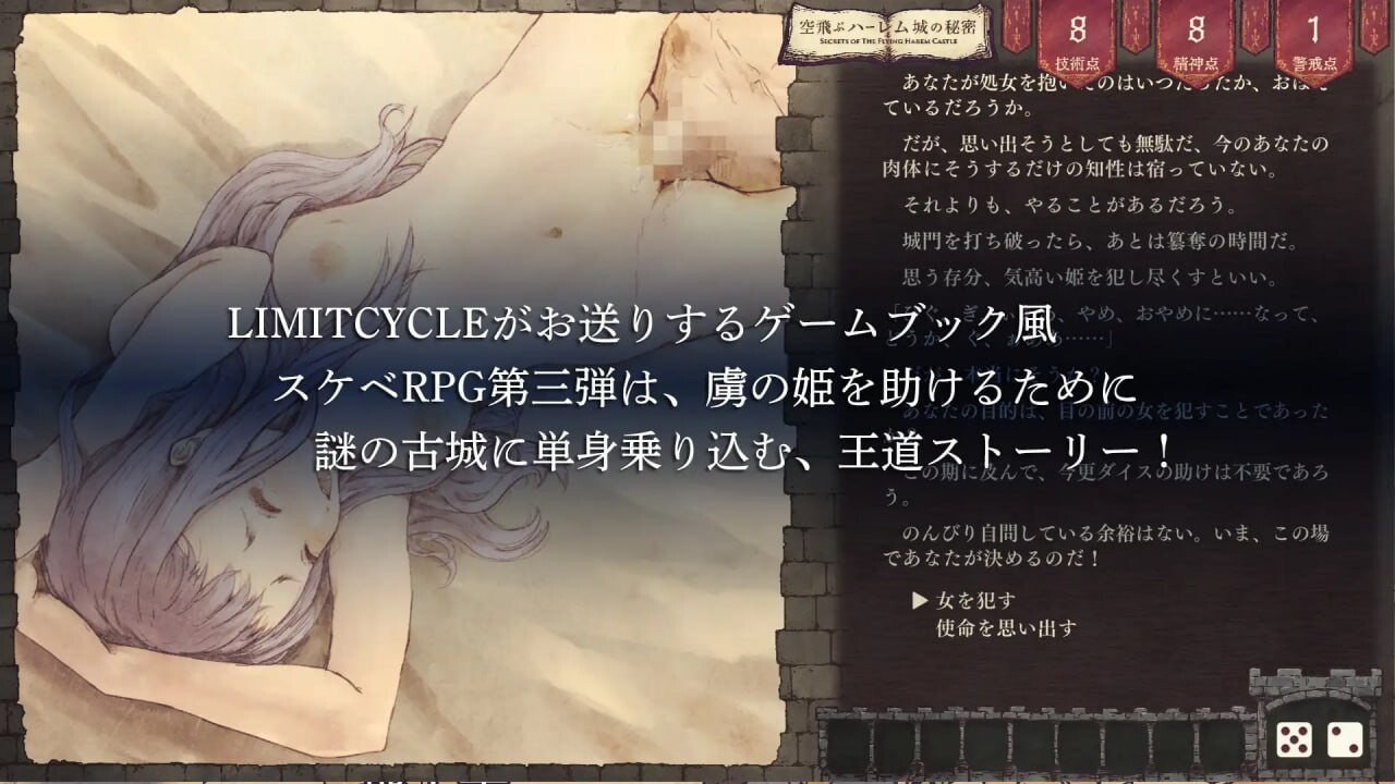 这是由LIMITCYCLE带来的游戏书风格色色RPG第三弹,讲述了一位营救被俘公主的主角,单枪匹马闯入神秘古城的王道故事。