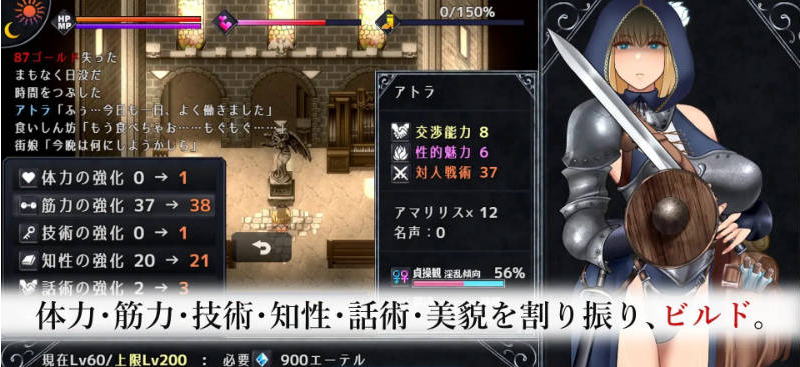 可以自由分配和培养体力、力量、技术、智力、口才、美貌等基础属性。初始选择的“出身”和三个“原初体验”会赋予“暴露癖”、“酒乱”、“肛门弱点”、“受虐狂”等丰富多彩的初始能力。能力也会根据游玩倾向获得新的赋予,结合体现在立绘上的装备,可以实现诸如“肛门弱点的高洁处女女骑士”或“邪恶的滥交变态修女”等广泛的角色构建和扮演。