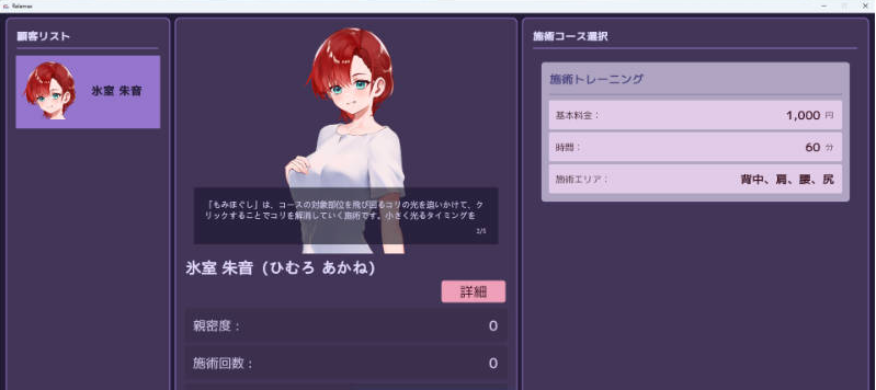 你作为按摩店“Relax”的店长,任务是让顾客满意、逐步提升口碑评价等级。随着等级提高,你将解锁各种按摩技法、沟通技巧以及道具。