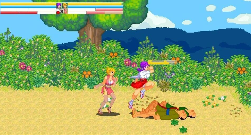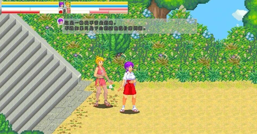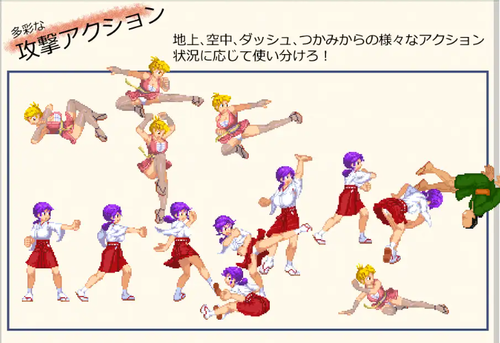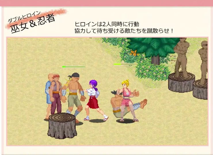 这是一款由巫女Kanna和忍者AoI两人一起前进的横版卷轴动作游戏。