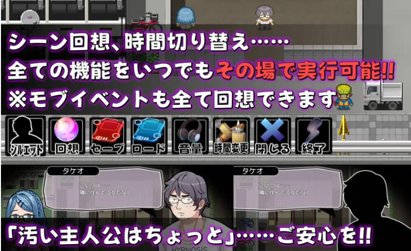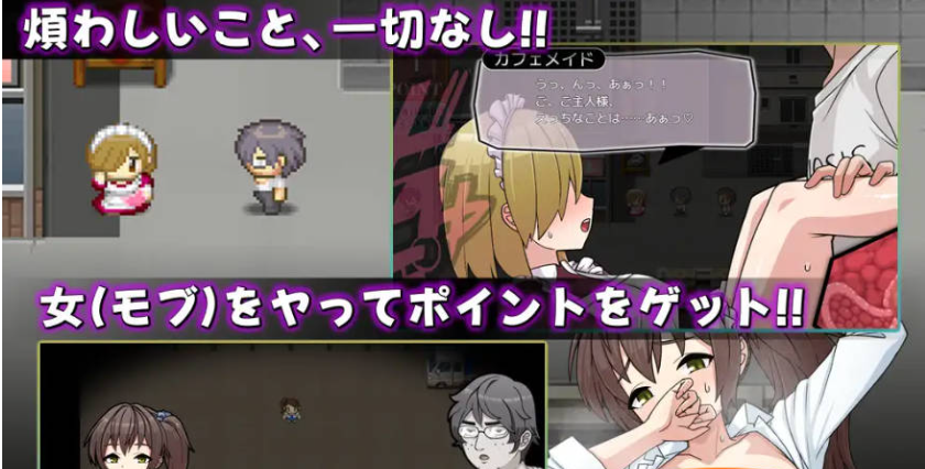 切换昼夜探索街道,看到女性(路人)就侵犯她们来获取点数。