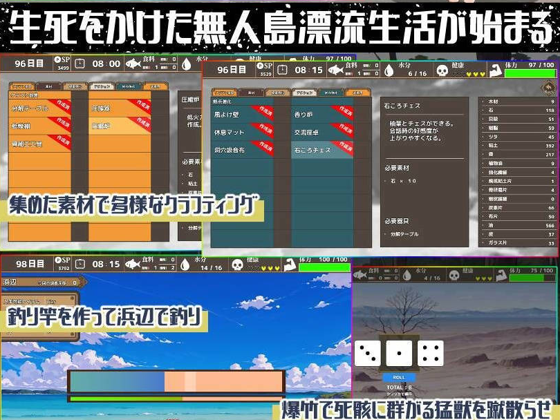 -首先,探索海滩、丛林和其他你能到达的区域,并收集食物和水。