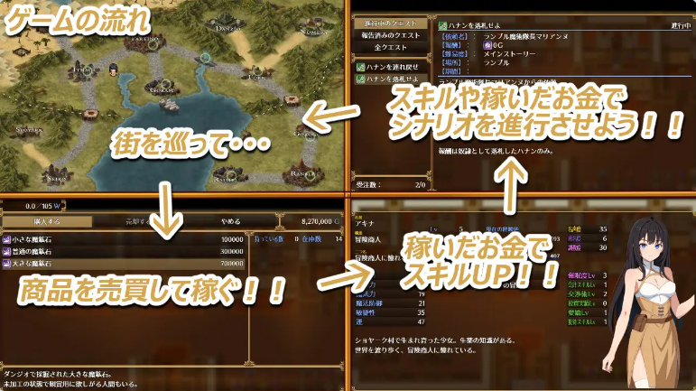 这是一款操作明菜进行商品买卖、赚钱推进故事发展,同时会触发各种 H 场景的 RPG 游戏。